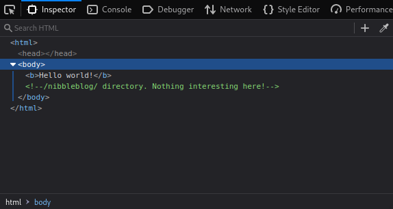 Heading to the IP in a browser reveals a “Hello World!” page, with nothing interesting. We can take a look at the HTML source code with browser dev tools, which shows a comment suggesting to head to /nibbleblog.