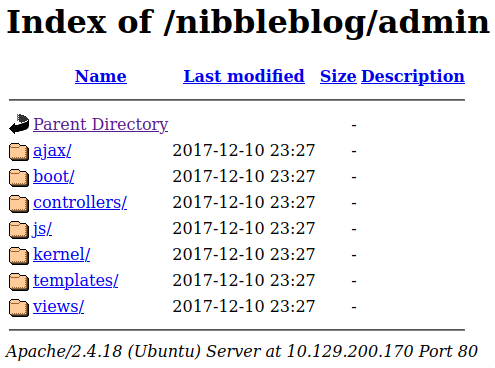Looking around in the server directories finds nothing interesting, but we can confirm that an admin user exists from the file at http://10.129.200.170/nibbleblog/content/private/users.xml